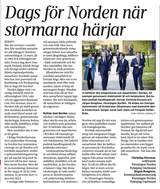 I dag publicerar Södermanlands Nyheter en debattartikel av mig och Christina Ericsson, ordförande Föreningen Norden Nyköping, om breddat och fördjupat nordiskt samarbete. Den har rubriken ”Dags för Norden när stormarna härjar”.