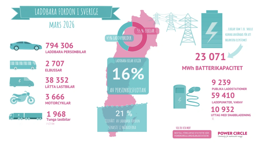 De senaste tolv månaderna har nyregistreringen av laddbara fordon ökat med 21 procent. I mars 2026 var 66 procent av alla nyregistrerade bilar i laddningsbara; det är en ökning från helår 2025, då genomsnittet var 61 procent.